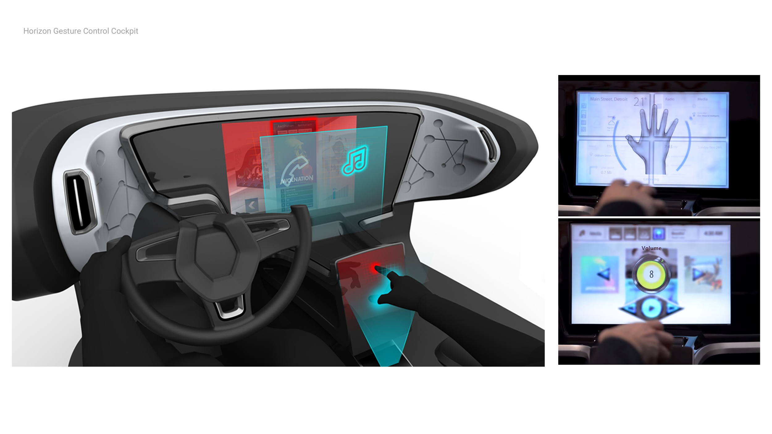 Horizon was a project around a spatial gesture input modality, and later developing a UX around a multi-layer display with the gesture input. I was tasked with continuously integrating various off the shelf tech into a cockpit like experience.